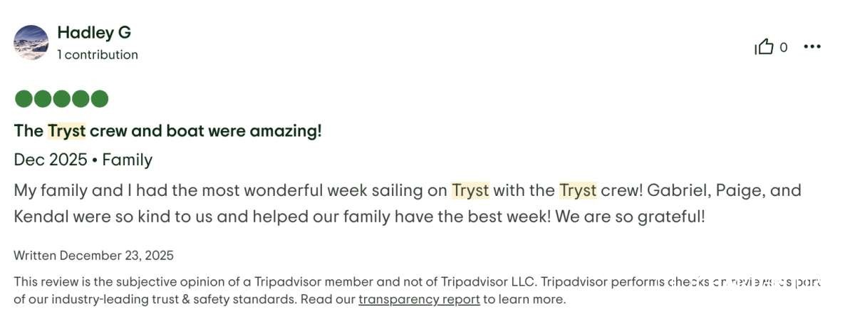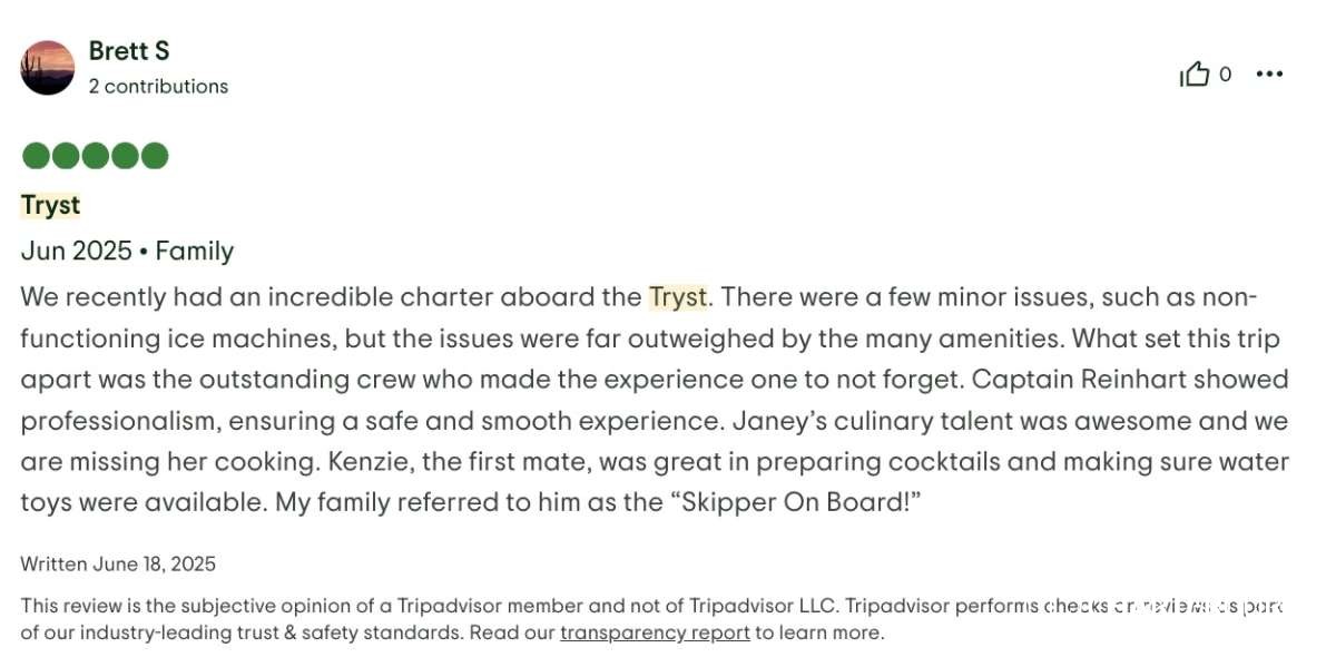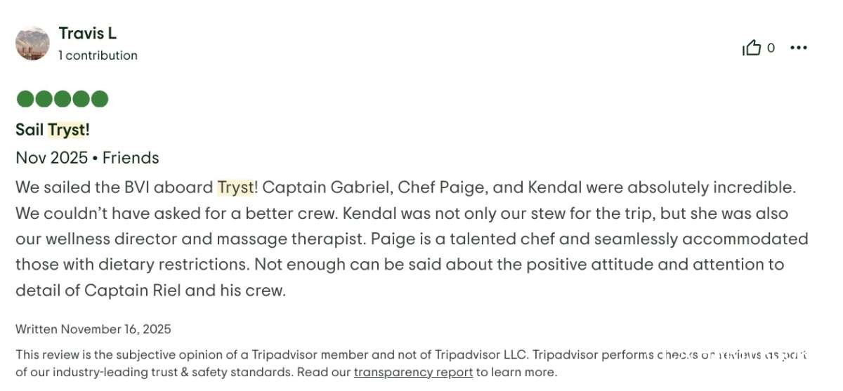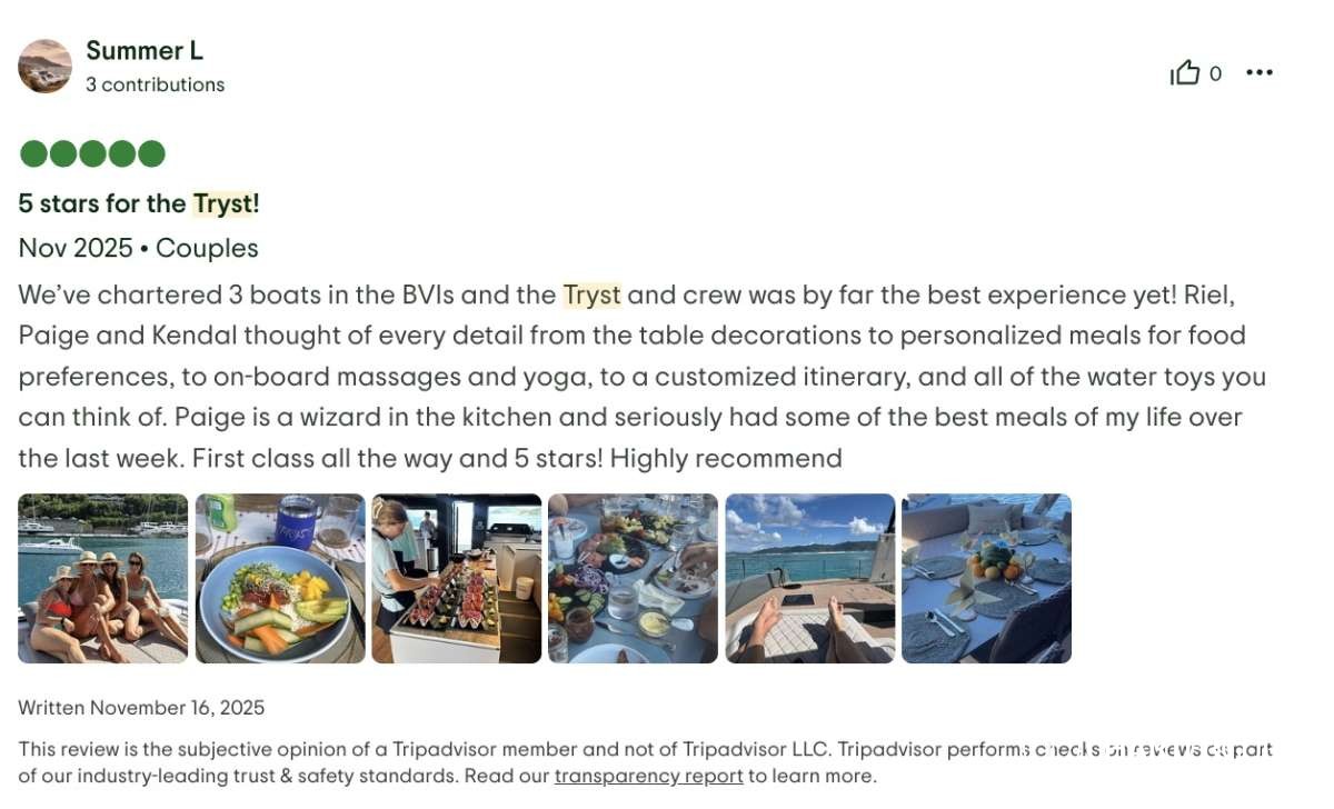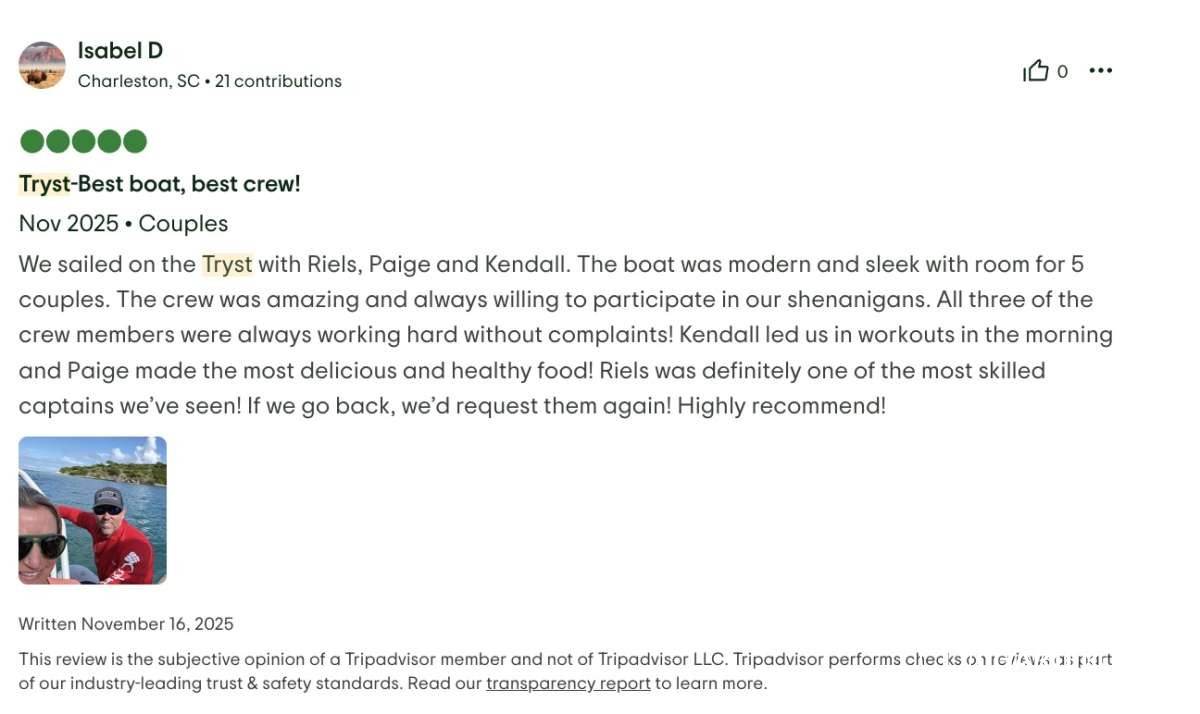 The best part- the crew! First of all, having three crew was a game changer! The captain, Riel, could 100% focus on the boat, water toys and itinerary. The chef, Paige could 100% focus on preparing meals and assisting the captain. And then our masseuse, Kendal, was our “hostess with the mostess”. Having that extra person to be not just the masseuse and cleaner, but also the bartender, picture taker and bubbly event hostess was fabulous. The 3 of them worked so seamlessly together, you could tell that they enjoyed it, were very professional, had quite a bit of experience and know every detail that is needed to proactively make a trip perfect. The food was beyond amazing and perfectly tailored to our tastes. The massages and morning workouts were a fantastic addition. Drinks were perfection. The itinerary was flawless. And the edited video of the trip they did for us was a fantastic surprise, loved it! We will always remember all the amazing chats and hangouts we had with the crew and the extremely elevated experience of the trip they provided.