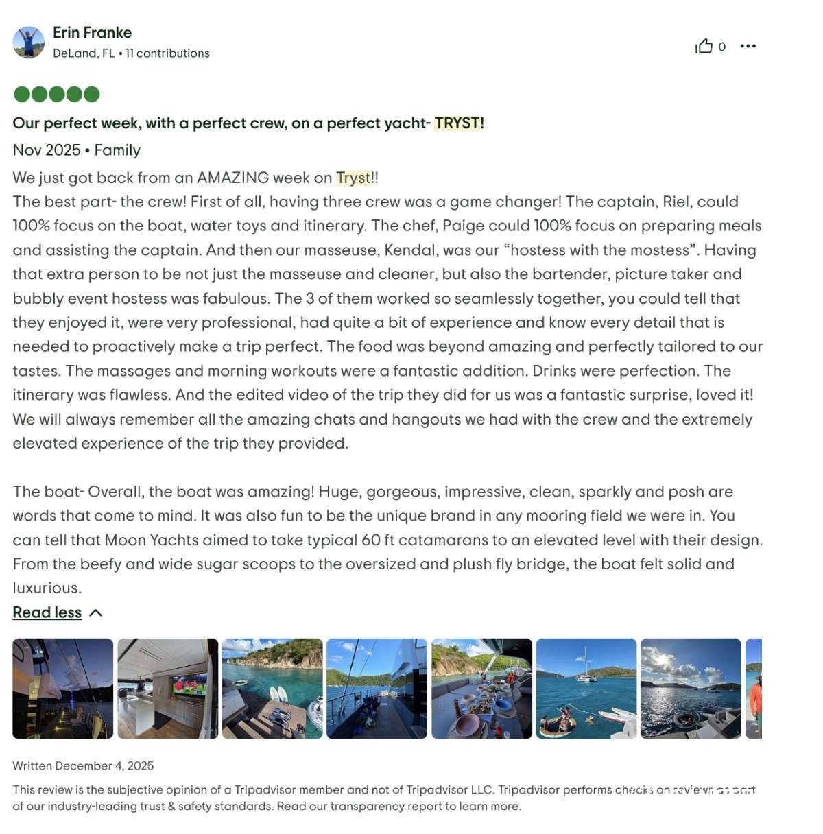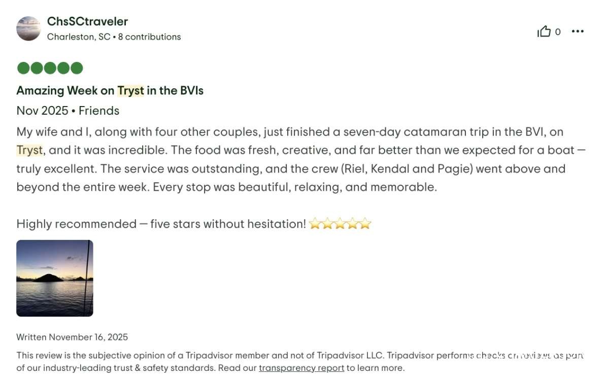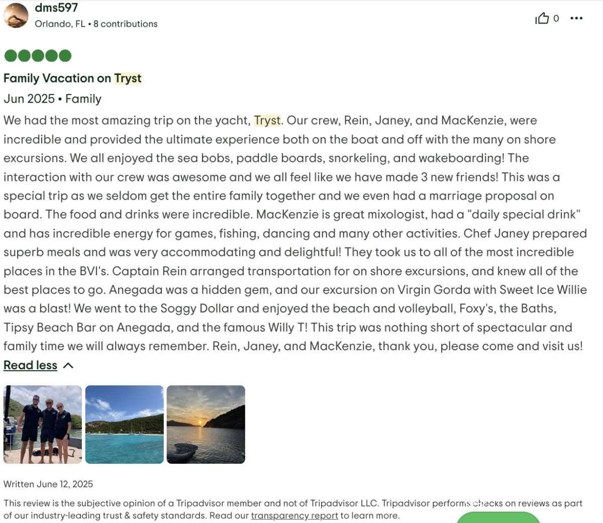 The best part- the crew! First of all, having three crew was a game changer! The captain, Riel, could 100% focus on the boat, water toys and itinerary. The chef, Paige could 100% focus on preparing meals and assisting the captain. And then our masseuse, Kendal, was our “hostess with the mostess”. Having that extra person to be not just the masseuse and cleaner, but also the bartender, picture taker and bubbly event hostess was fabulous. The 3 of them worked so seamlessly together, you could tell that they enjoyed it, were very professional, had quite a bit of experience and know every detail that is needed to proactively make a trip perfect. The food was beyond amazing and perfectly tailored to our tastes. The massages and morning workouts were a fantastic addition. Drinks were perfection. The itinerary was flawless. And the edited video of the trip they did for us was a fantastic surprise, loved it! We will always remember all the amazing chats and hangouts we had with the crew and the extremely elevated experience of the trip they provided.