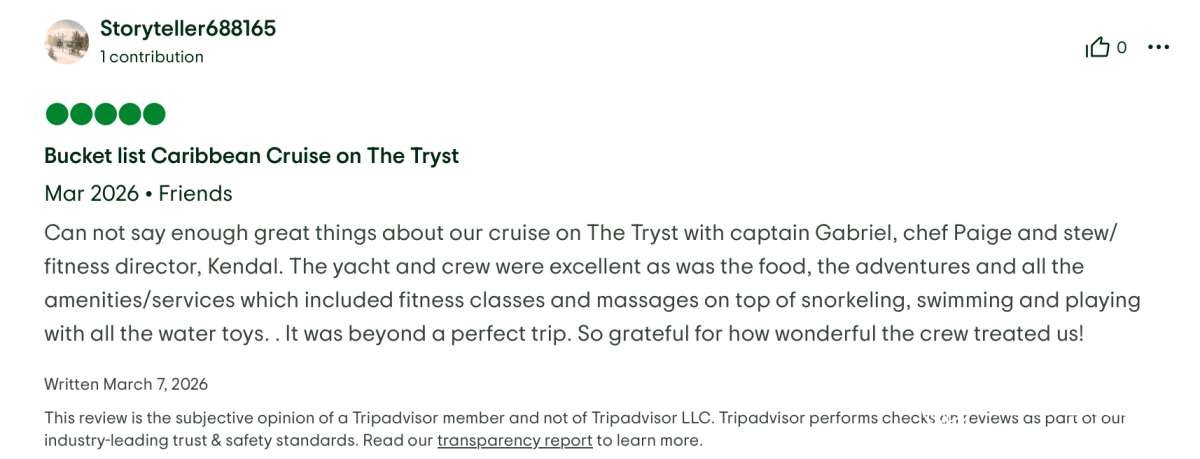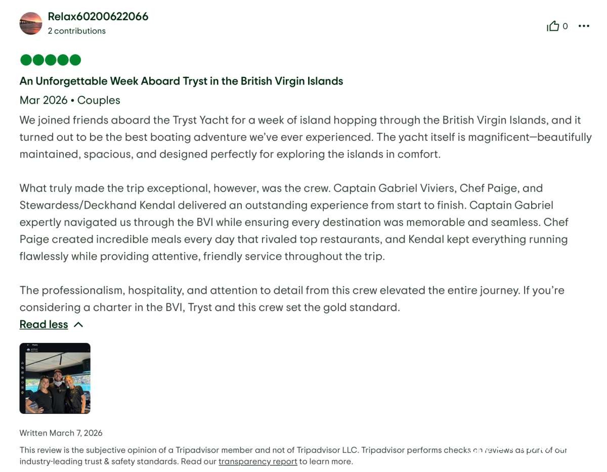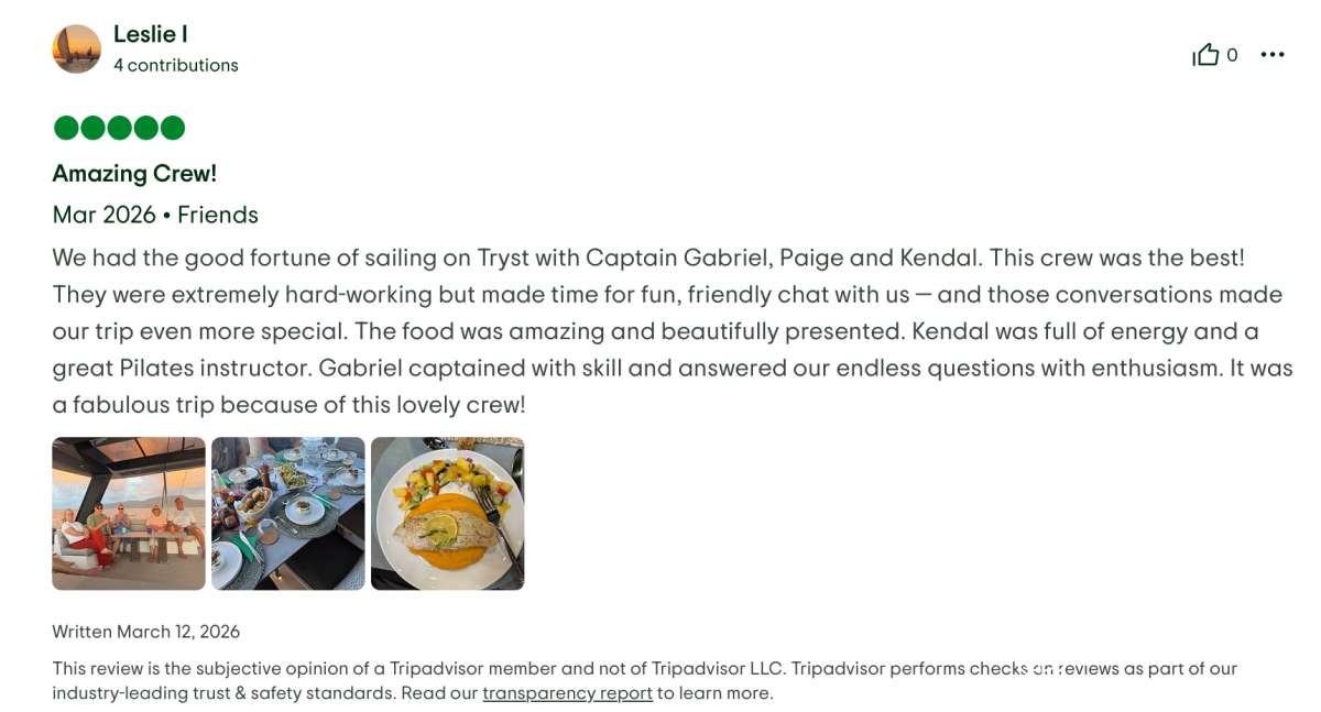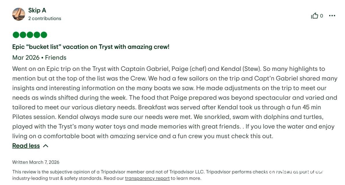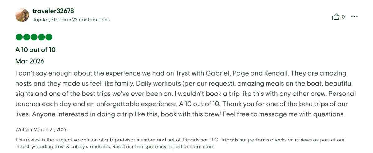 The best part- the crew! First of all, having three crew was a game changer! The captain, Riel, could 100% focus on the boat, water toys and itinerary. The chef, Paige could 100% focus on preparing meals and assisting the captain. And then our masseuse, Kendal, was our “hostess with the mostess”. Having that extra person to be not just the masseuse and cleaner, but also the bartender, picture taker and bubbly event hostess was fabulous. The 3 of them worked so seamlessly together, you could tell that they enjoyed it, were very professional, had quite a bit of experience and know every detail that is needed to proactively make a trip perfect. The food was beyond amazing and perfectly tailored to our tastes. The massages and morning workouts were a fantastic addition. Drinks were perfection. The itinerary was flawless. And the edited video of the trip they did for us was a fantastic surprise, loved it! We will always remember all the amazing chats and hangouts we had with the crew and the extremely elevated experience of the trip they provided.