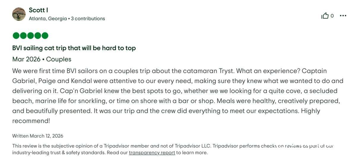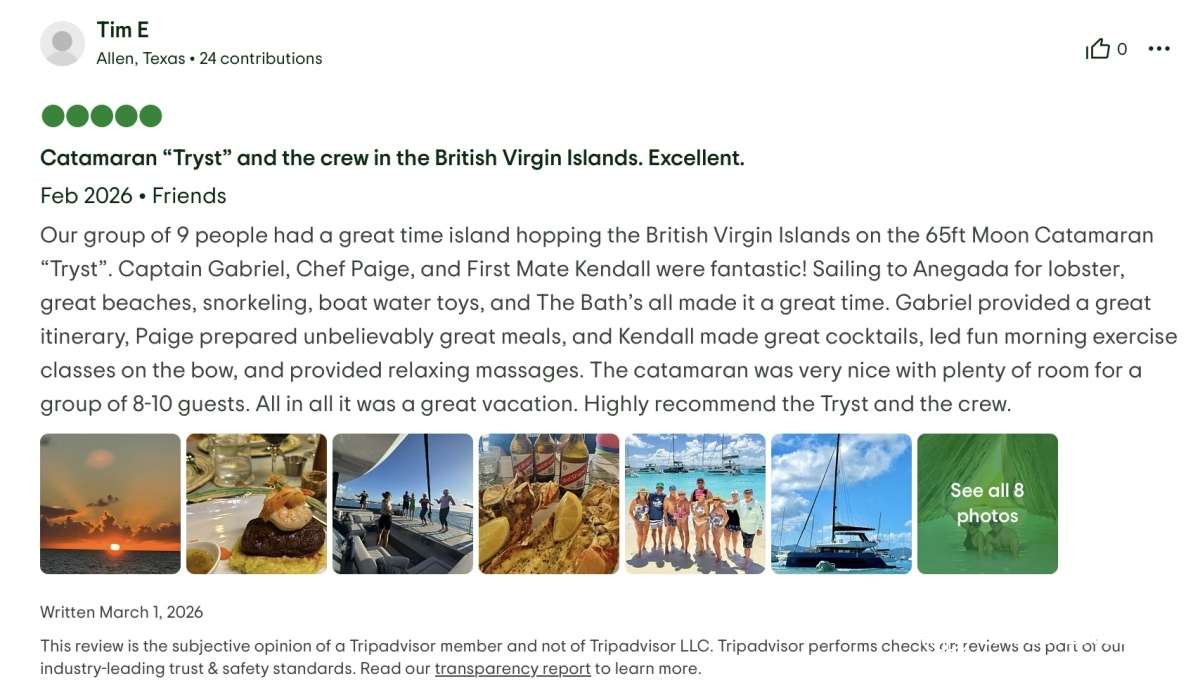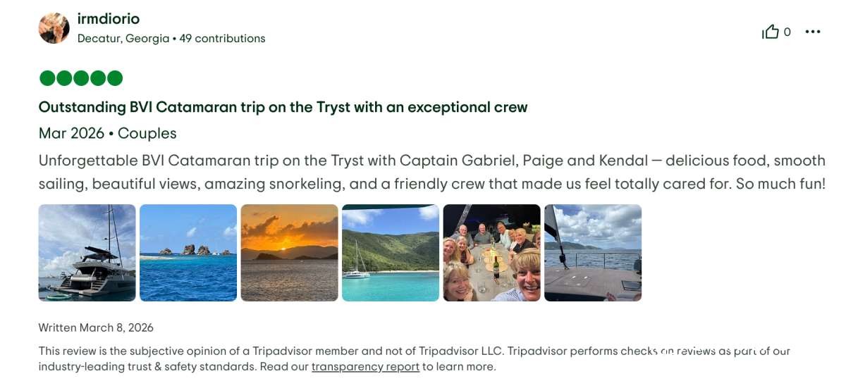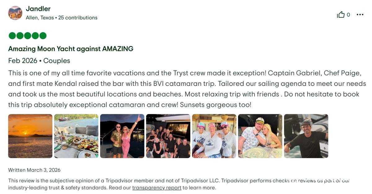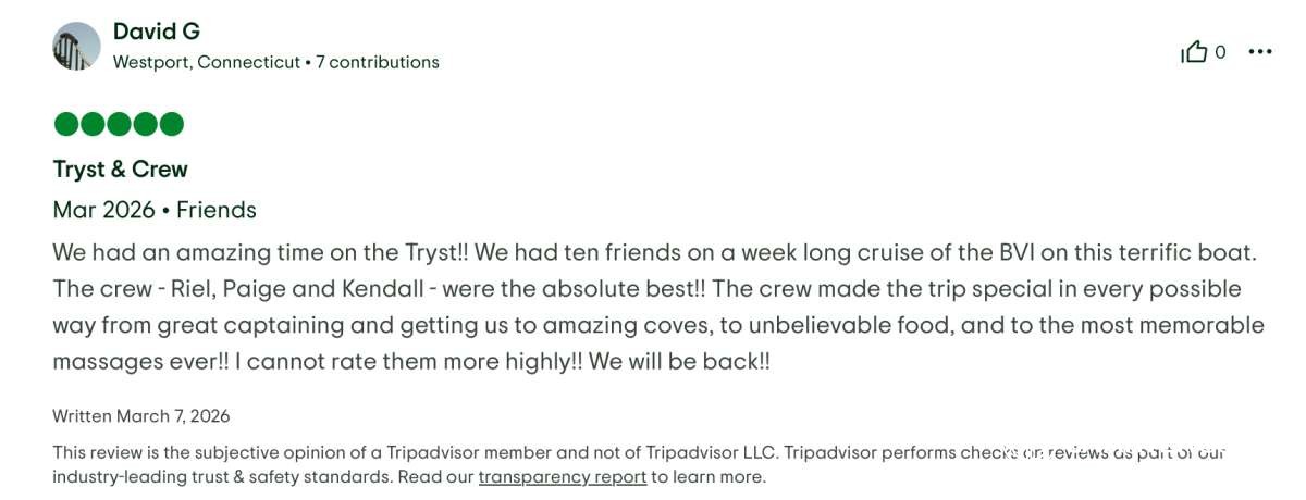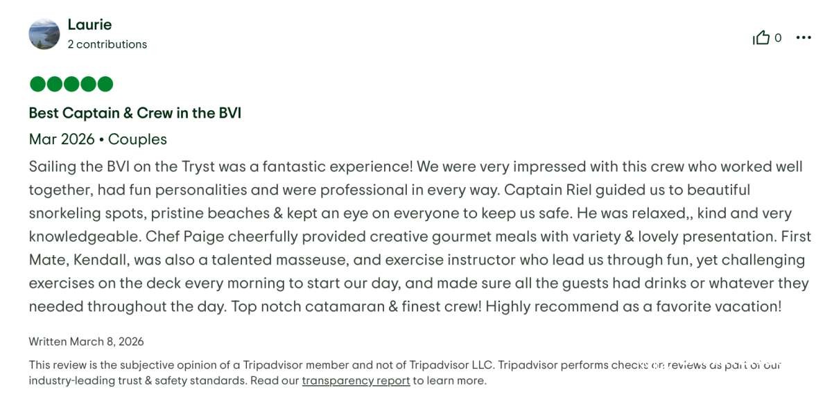 The best part- the crew! First of all, having three crew was a game changer! The captain, Riel, could 100% focus on the boat, water toys and itinerary. The chef, Paige could 100% focus on preparing meals and assisting the captain. And then our masseuse, Kendal, was our “hostess with the mostess”. Having that extra person to be not just the masseuse and cleaner, but also the bartender, picture taker and bubbly event hostess was fabulous. The 3 of them worked so seamlessly together, you could tell that they enjoyed it, were very professional, had quite a bit of experience and know every detail that is needed to proactively make a trip perfect. The food was beyond amazing and perfectly tailored to our tastes. The massages and morning workouts were a fantastic addition. Drinks were perfection. The itinerary was flawless. And the edited video of the trip they did for us was a fantastic surprise, loved it! We will always remember all the amazing chats and hangouts we had with the crew and the extremely elevated experience of the trip they provided.