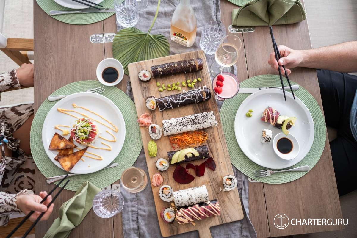 LOCAL FARE: Includes: 7 breakfasts, 5 lunches & 5 dinners. Requires 2 lunches and 2 dinners ashore at client expense. -For local fare, deduct $150 per person off the charter rate